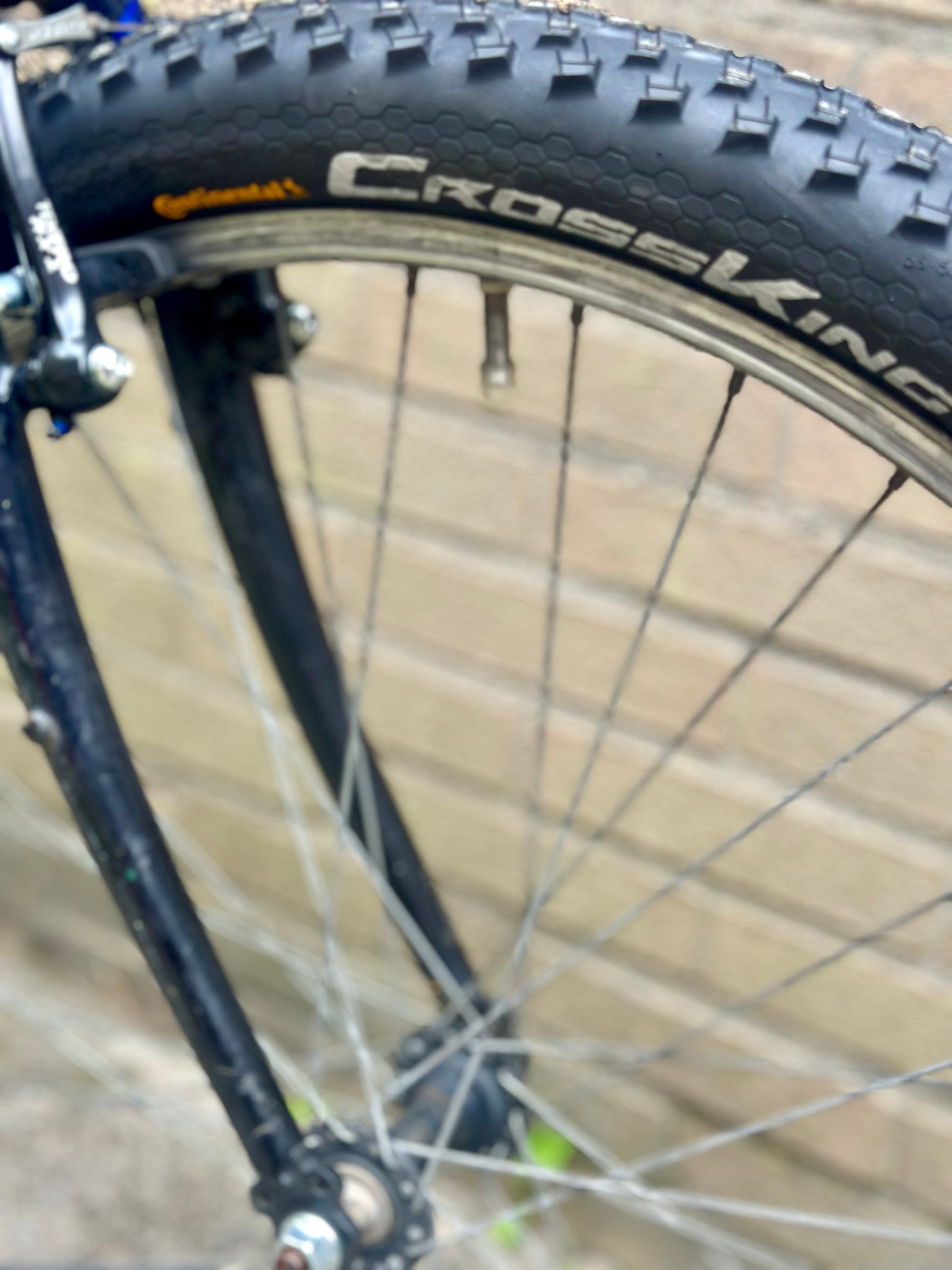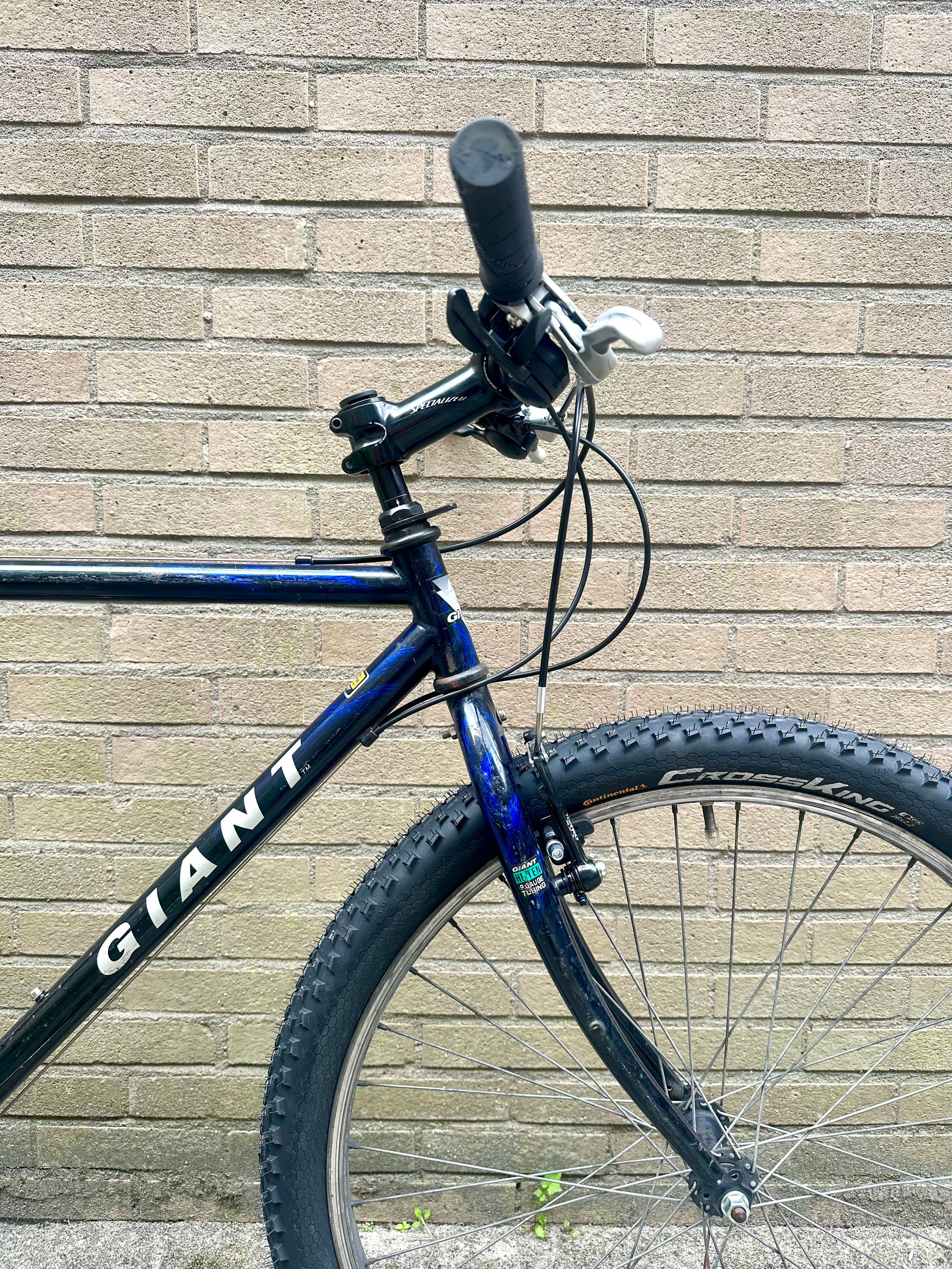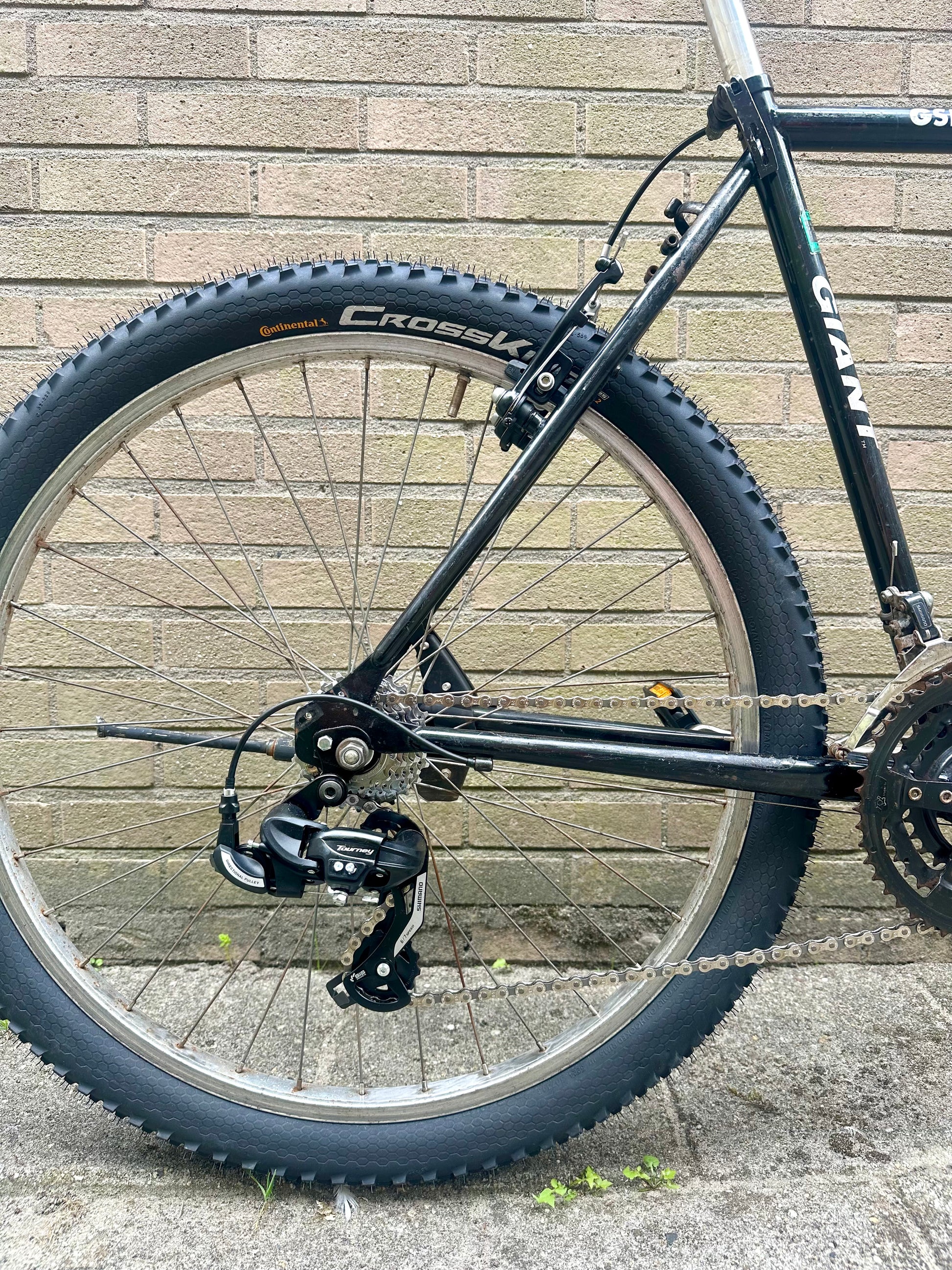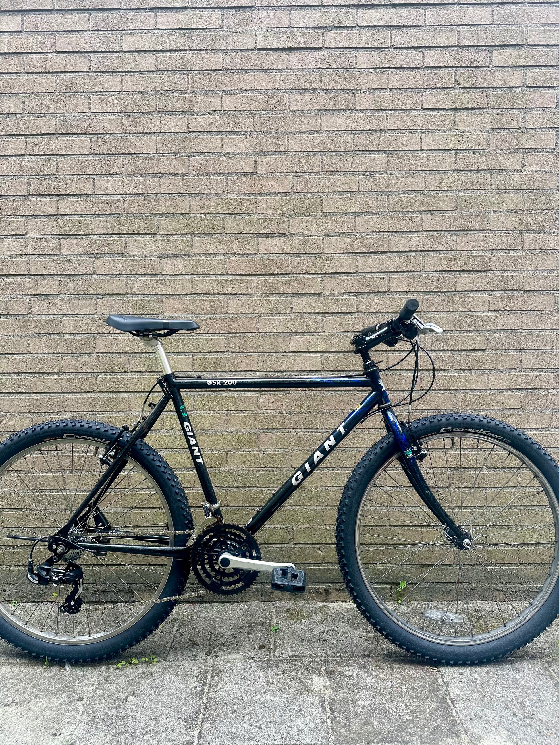 This Small Giant GSR200 gives big 90's hardtail energy. The solid CroMo frame cruises on 26" rims with fat Continetal Kross King tires. The tired grips shifters have been changed for newer trigger shifters with 7x3 gears. A new drivetrain means plenty of hassle free miles.