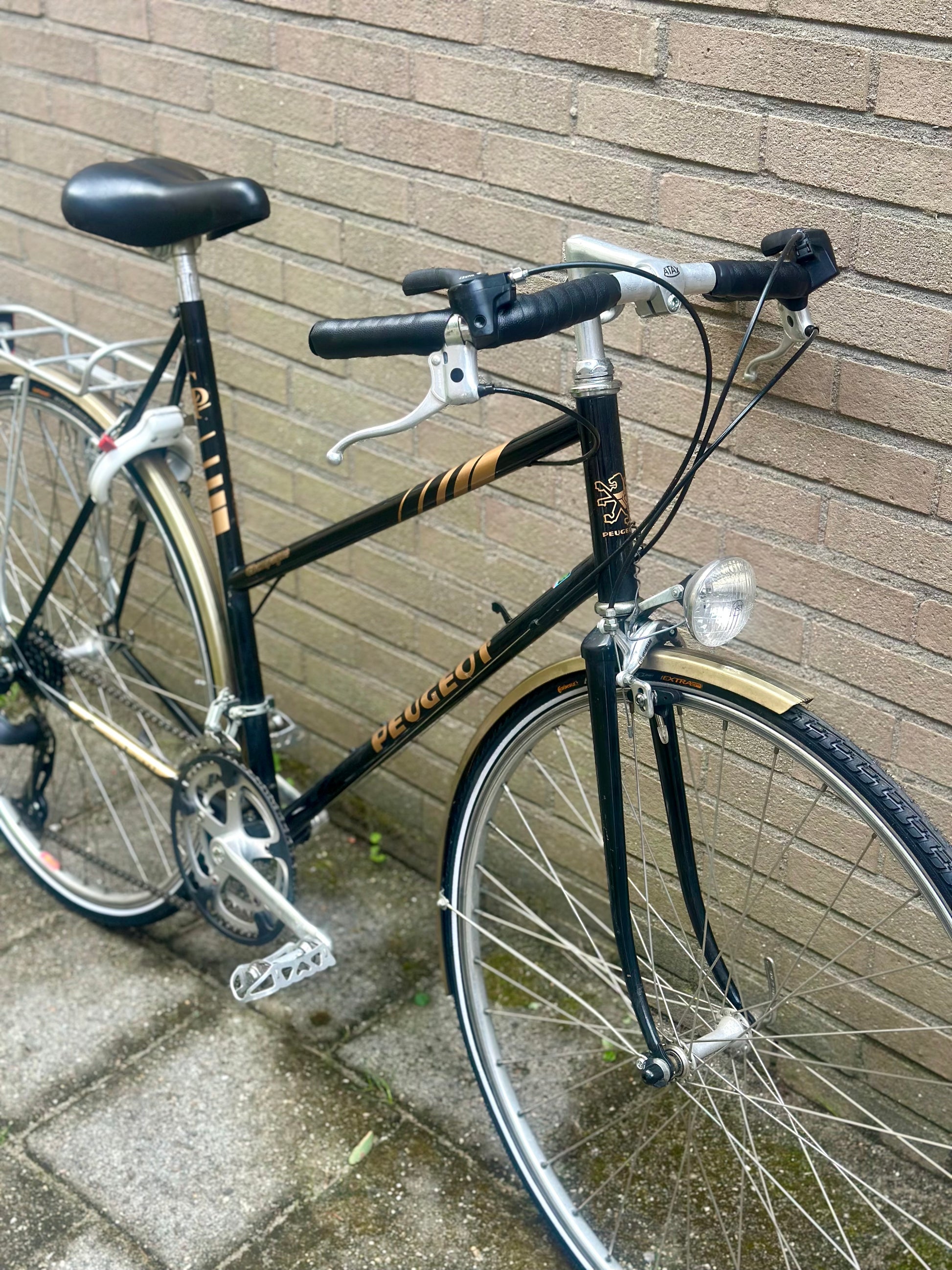 A lovely 80s Peugeot Mixte. This bike is made from Peugeot's HLE steel tubing and is one of the lighter step-through frames they made in that era. The original black paint with gold details is in perfect condition. Full mudguards, rear bag carrier, rear wheel lock, kick stand and original -still-working dynamo lights front and back make this bike as practical as it is stylish.