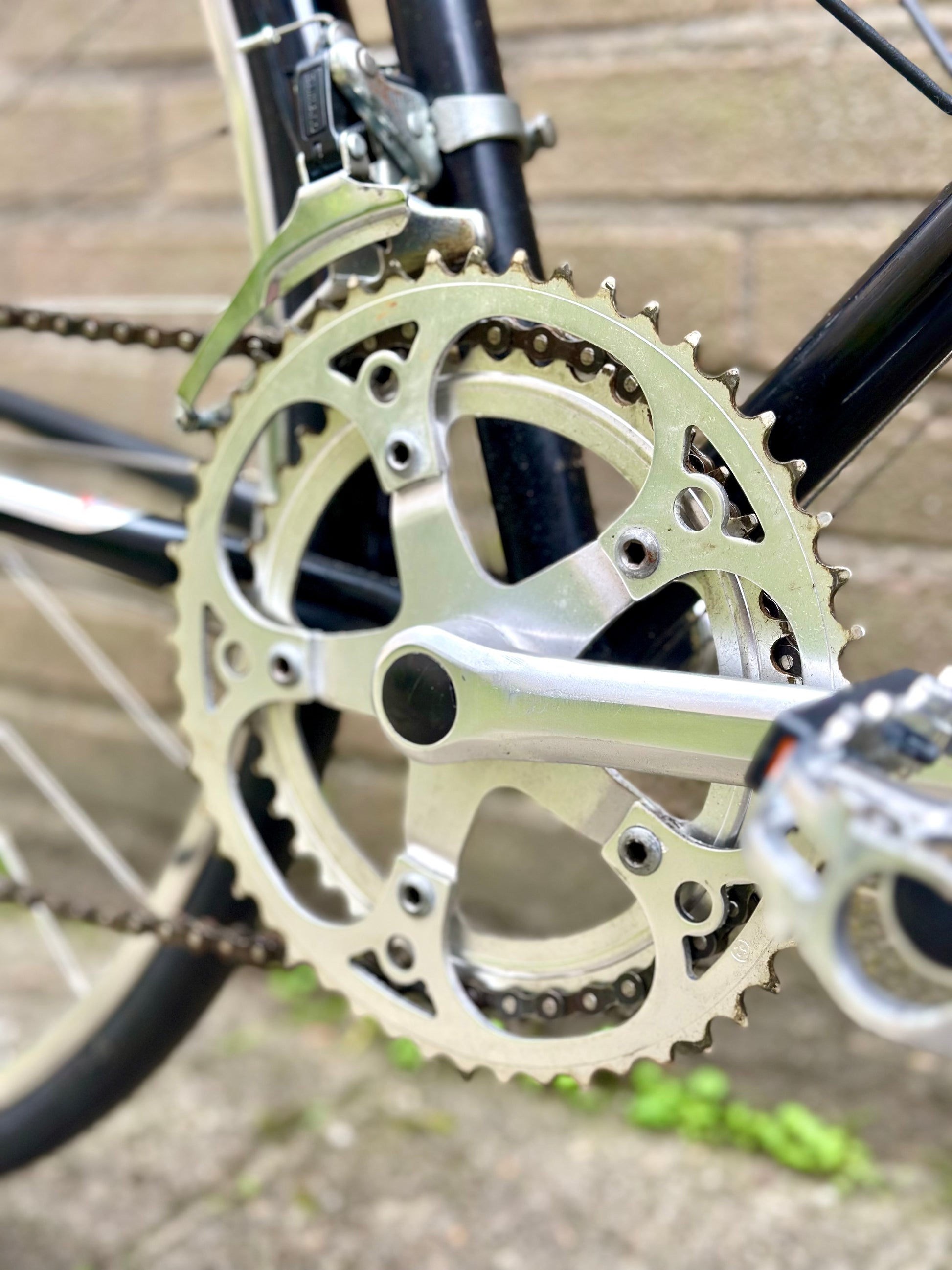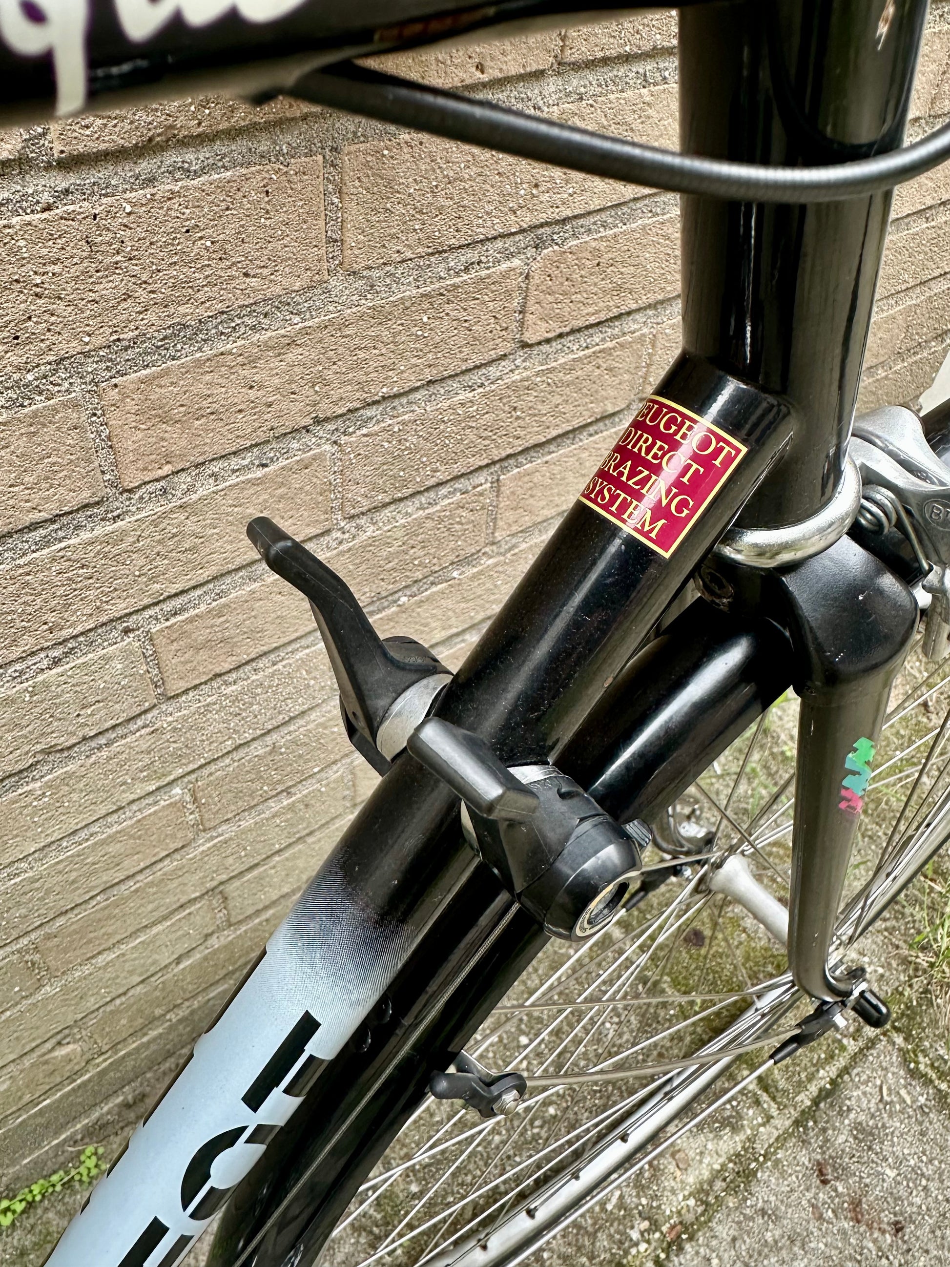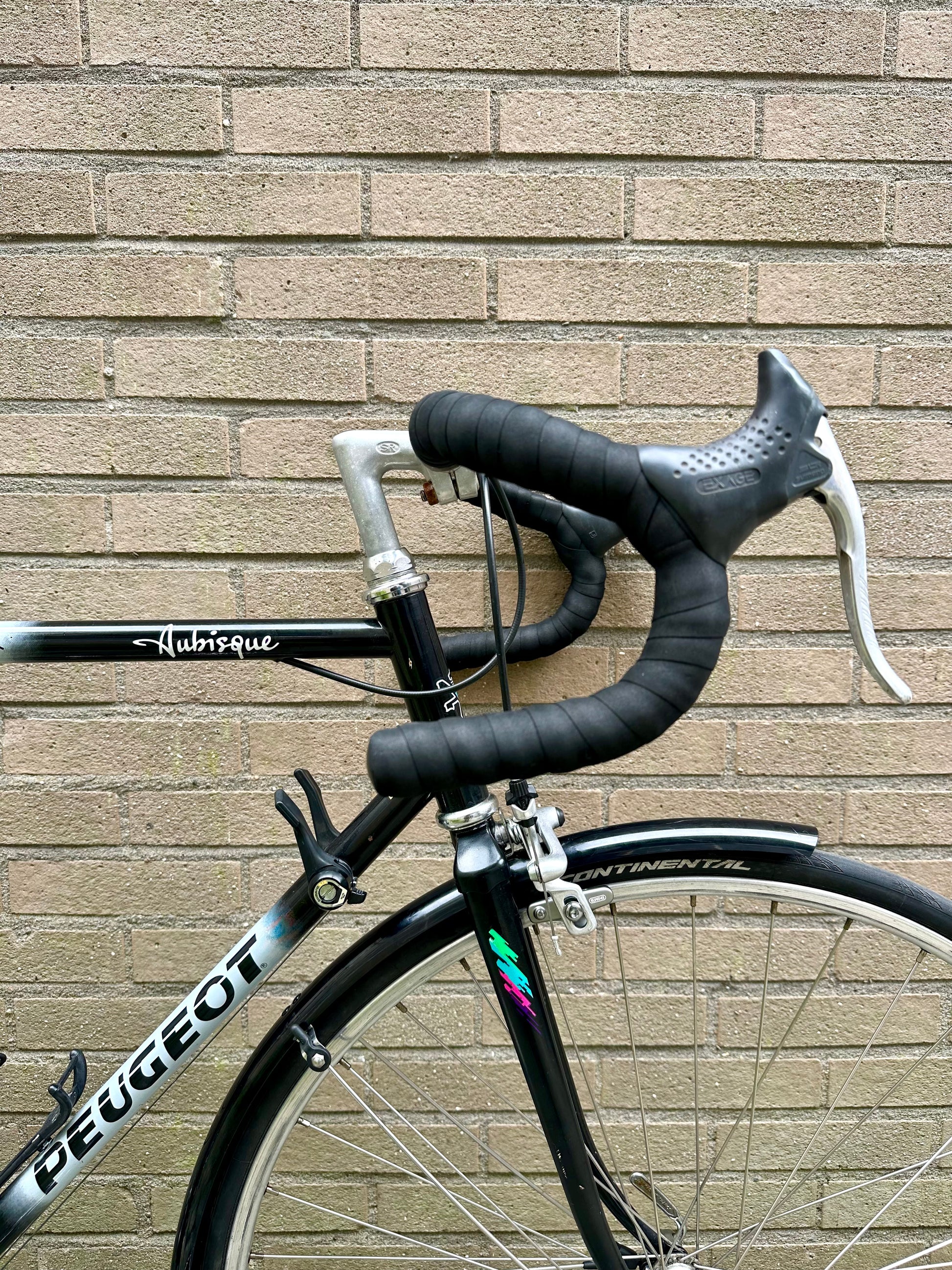 This Peugeot Aubisque is full of French style and is in top condition. Thanks to Peugeot's Direct Brazing System the HLE frame has clean lines with no visible joins. The original paint and decals are in good condition and the black and white outfit adds a touch of class.