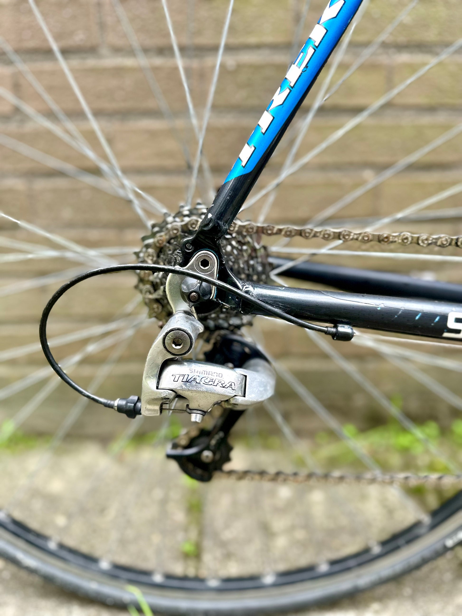 A neat Trek Domane endurance road bike equipped with a Shimano Tiagra groupset. This Trek harkens to the Discovery Channel Pro Cycling Team of the mid 2000s with the unmistakable Dicovery Channel logo on the down tube.
