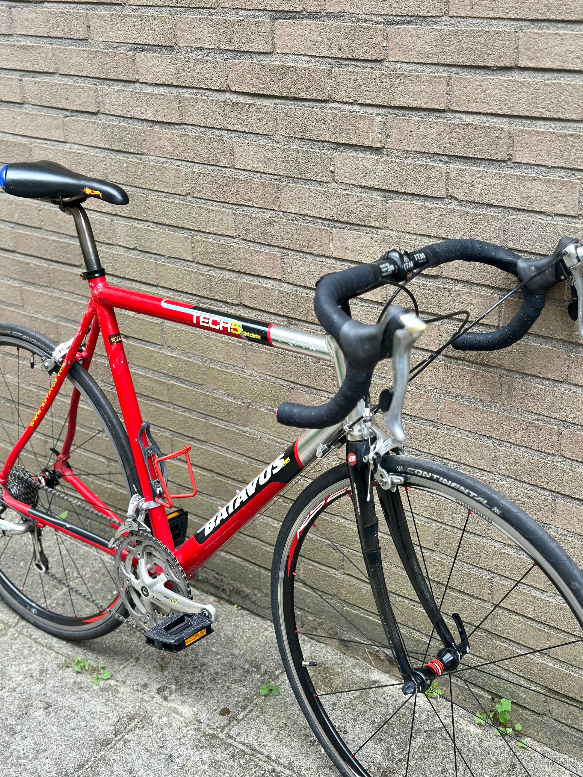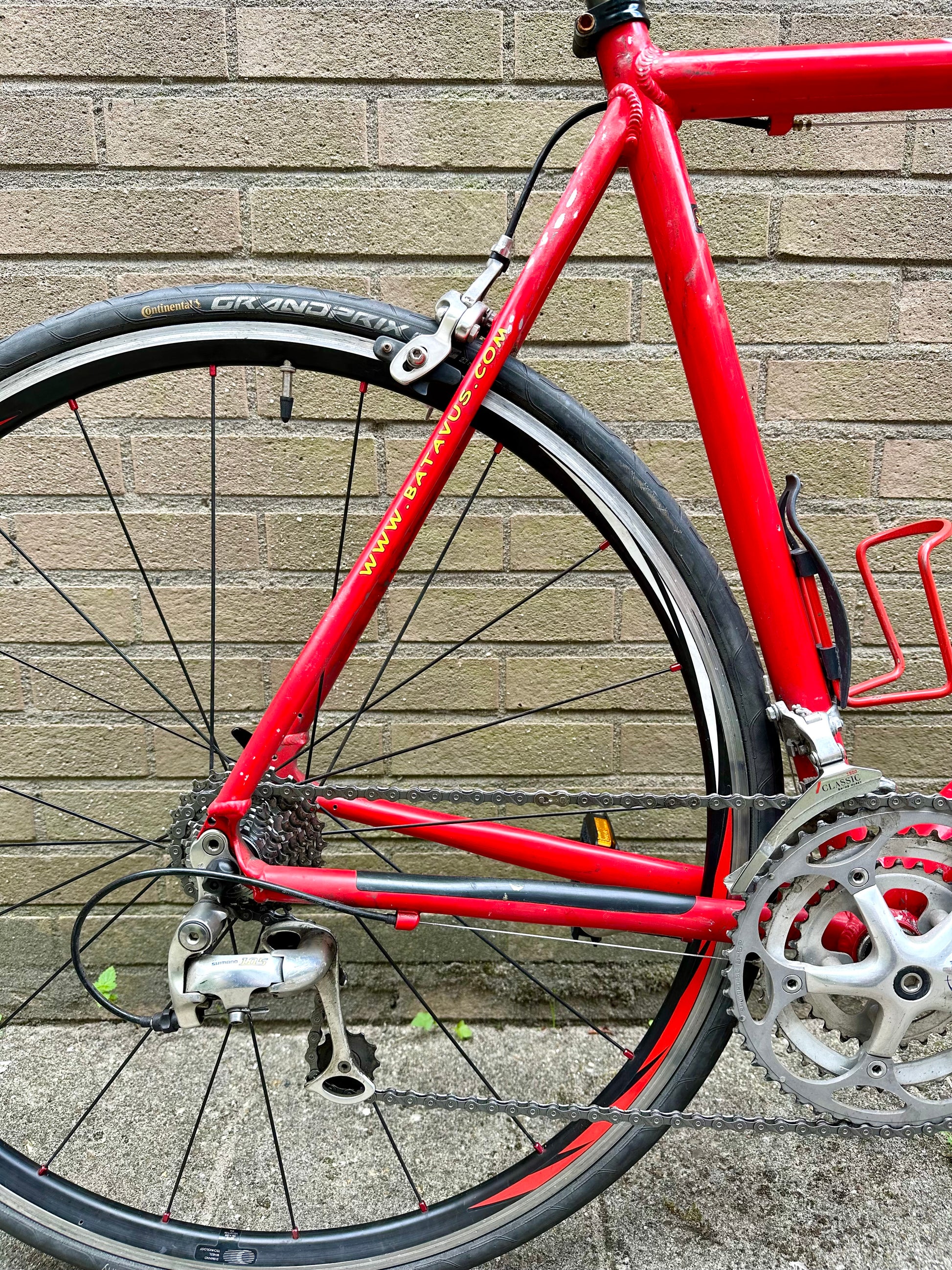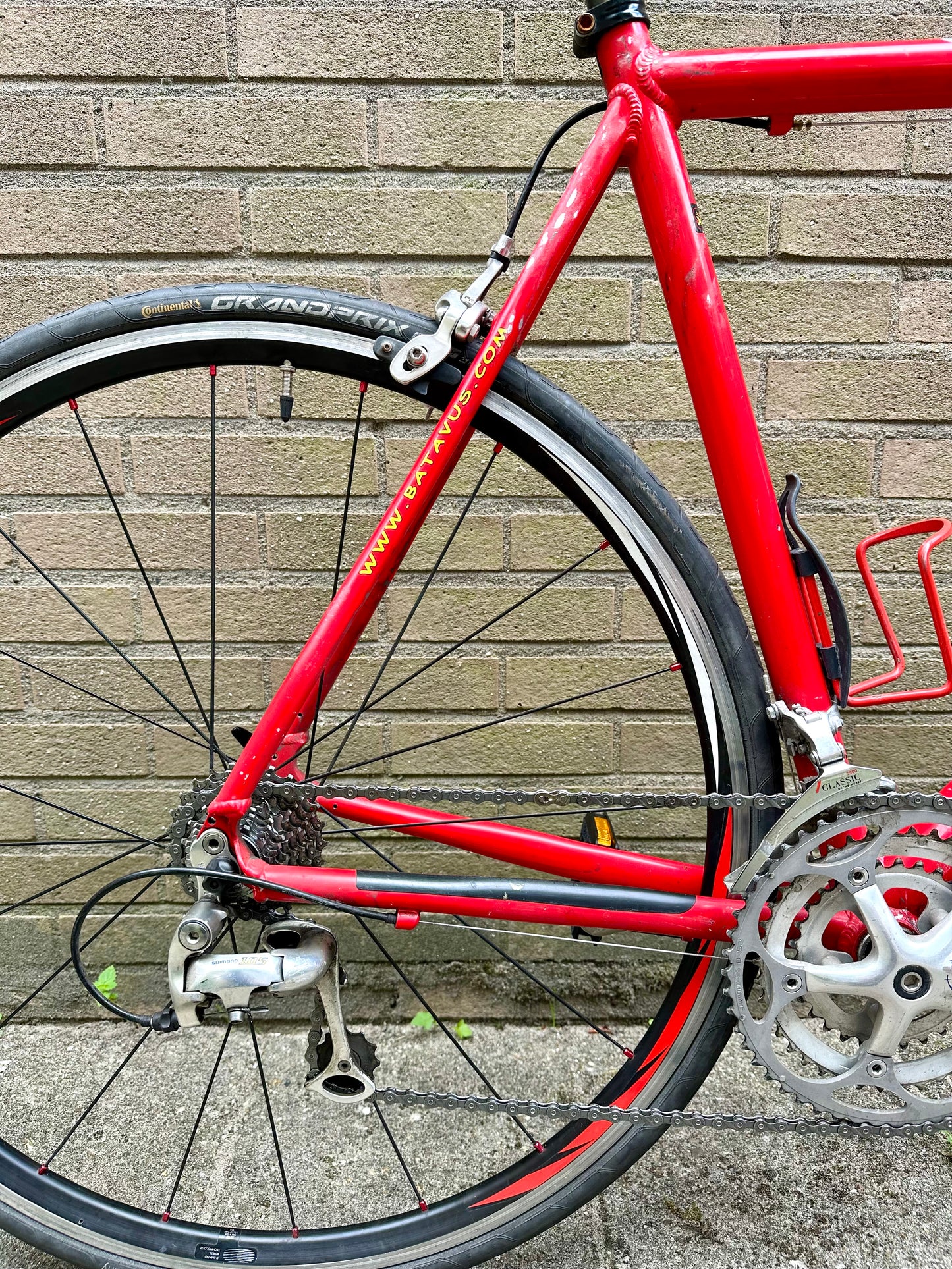 This early 2000's Batavus Tech 5 Series bicycle rides like a dream. It features a really light frame made from X Lite aluminium. The frame is in an eye-catching red colour, with black accent and a headtube portion with a shiny raw aluminium finish. The black accent combines well with the red and black Shimano WH-R520 wheelset.