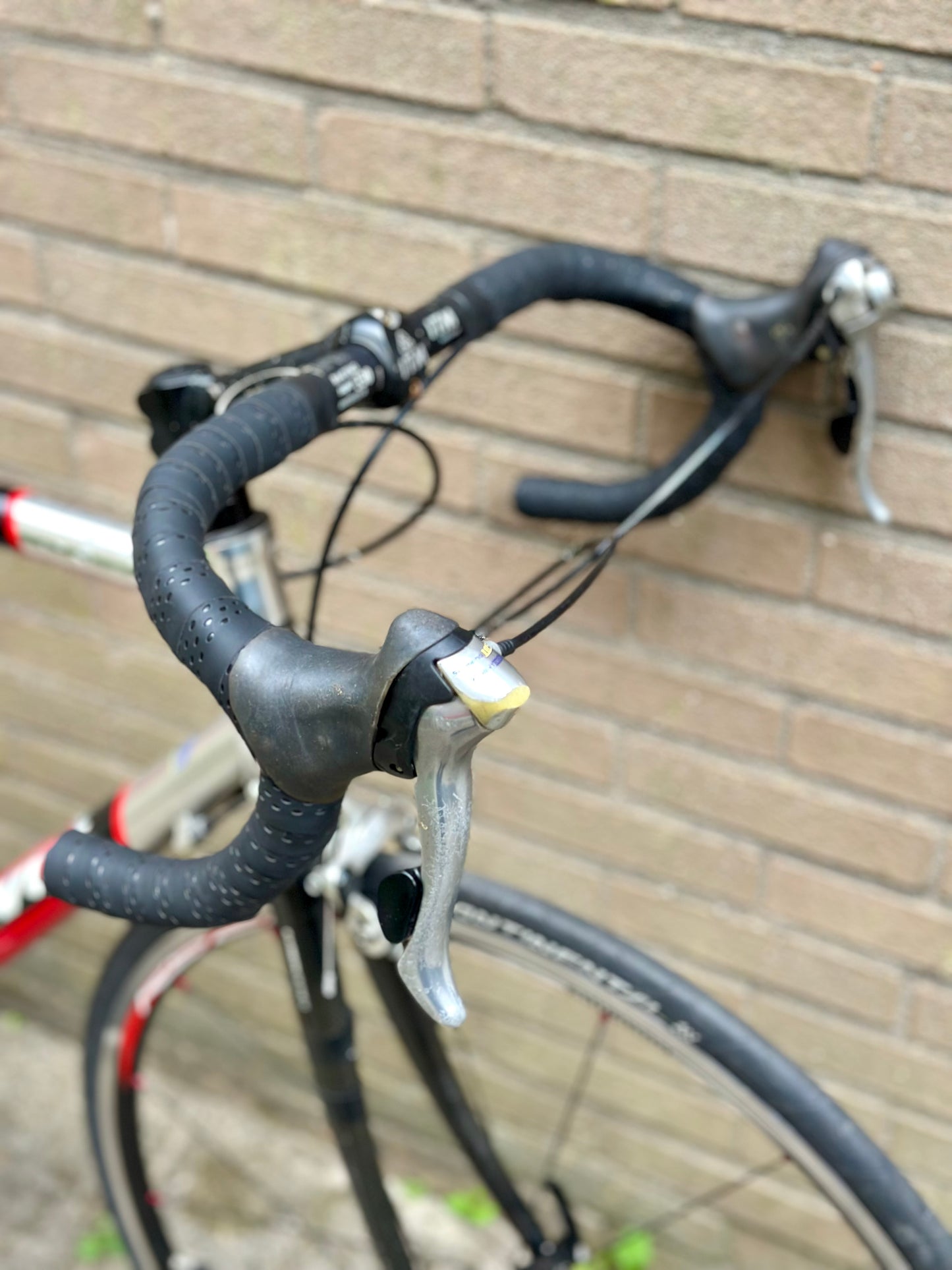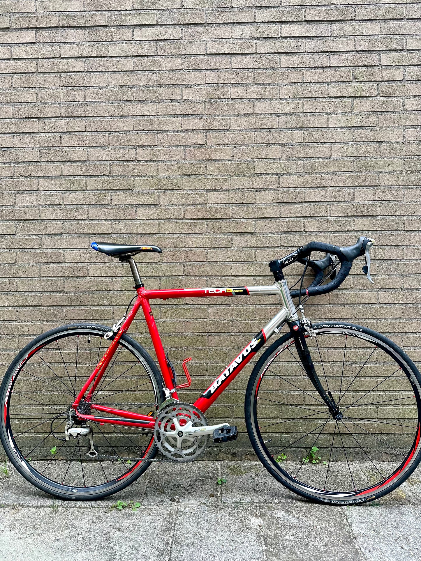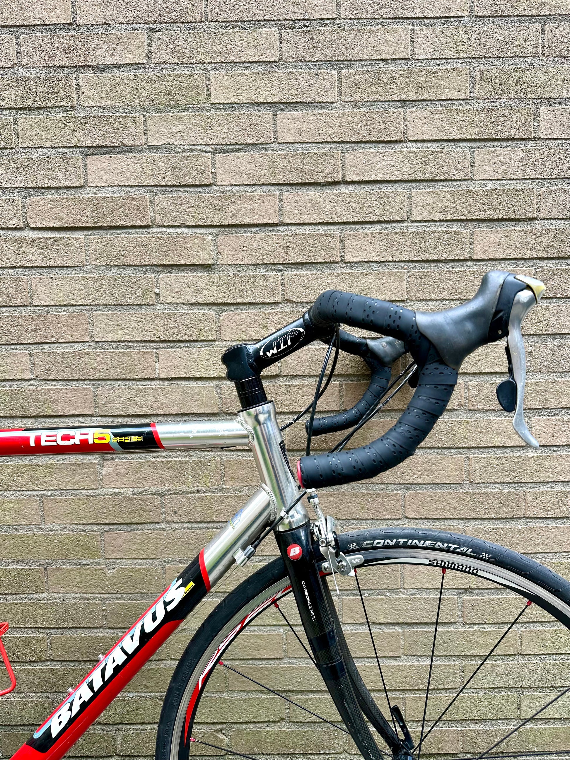 This early 2000's Batavus Tech 5 Series bicycle rides like a dream. It features a really light frame made from X Lite aluminium. The frame is in an eye-catching red colour, with black accent and a headtube portion with a shiny raw aluminium finish. The black accent combines well with the red and black Shimano WH-R520 wheelset.