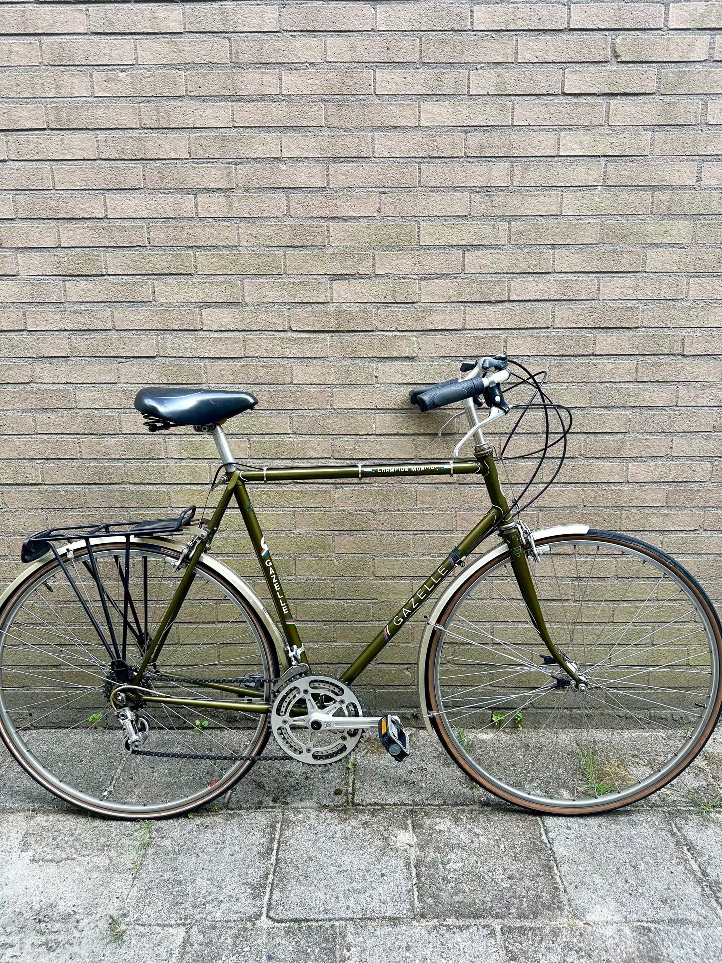 Beautiful 1970 Gazelle Champion Mondial in an olive green colour. Lovely detailed lugs and wrap around seat stay, Campgnolo dropouts. New riser bar adds a more modern and aggressive touch. Friction thumb shifters work great with the 5x2 Campagnolo derailleurs. Stronglight crank and Meada freewheel. Brand new Gusti Leather saddle - still rock hard - but once it breaks-in its a saddle for life!