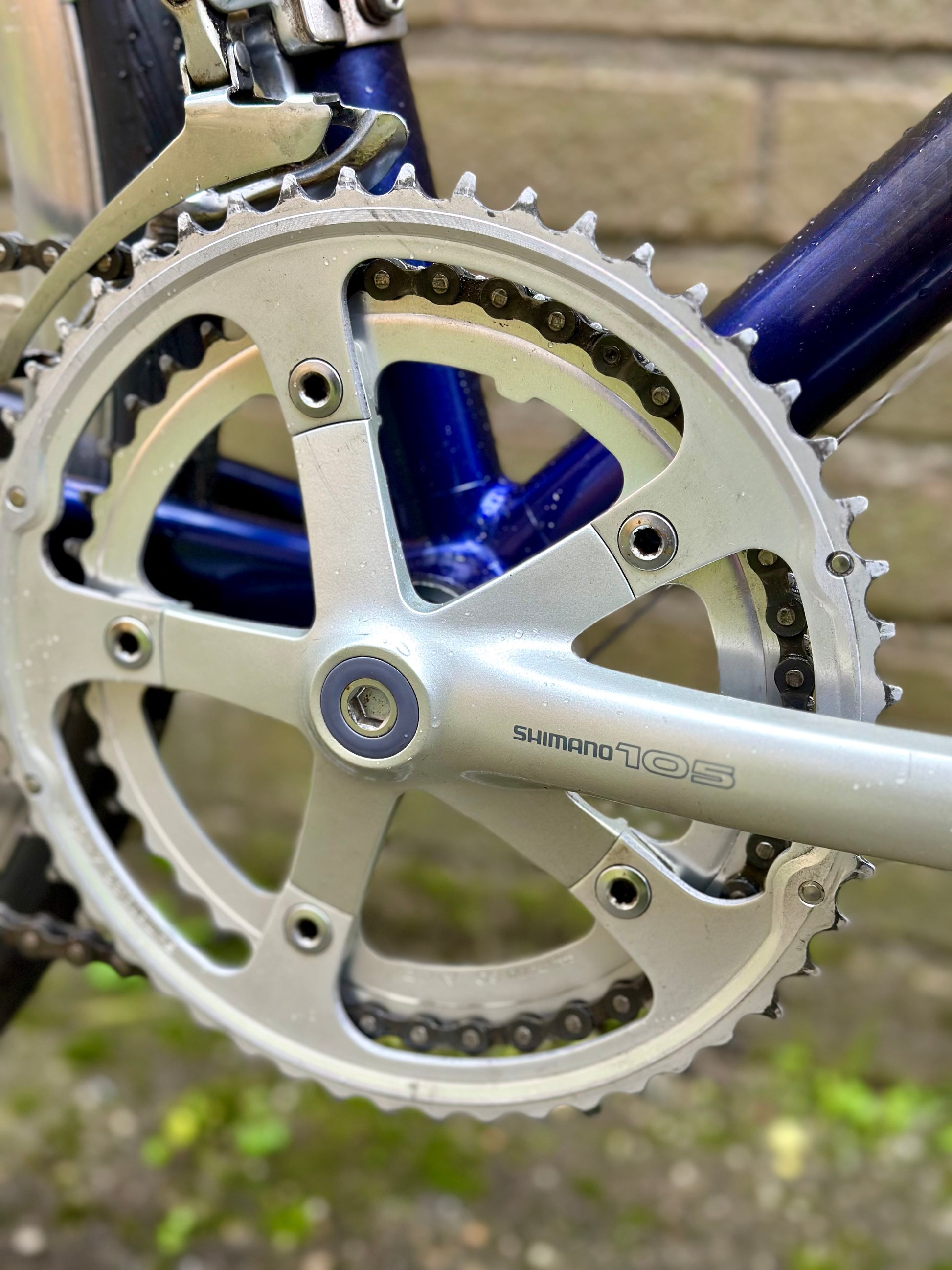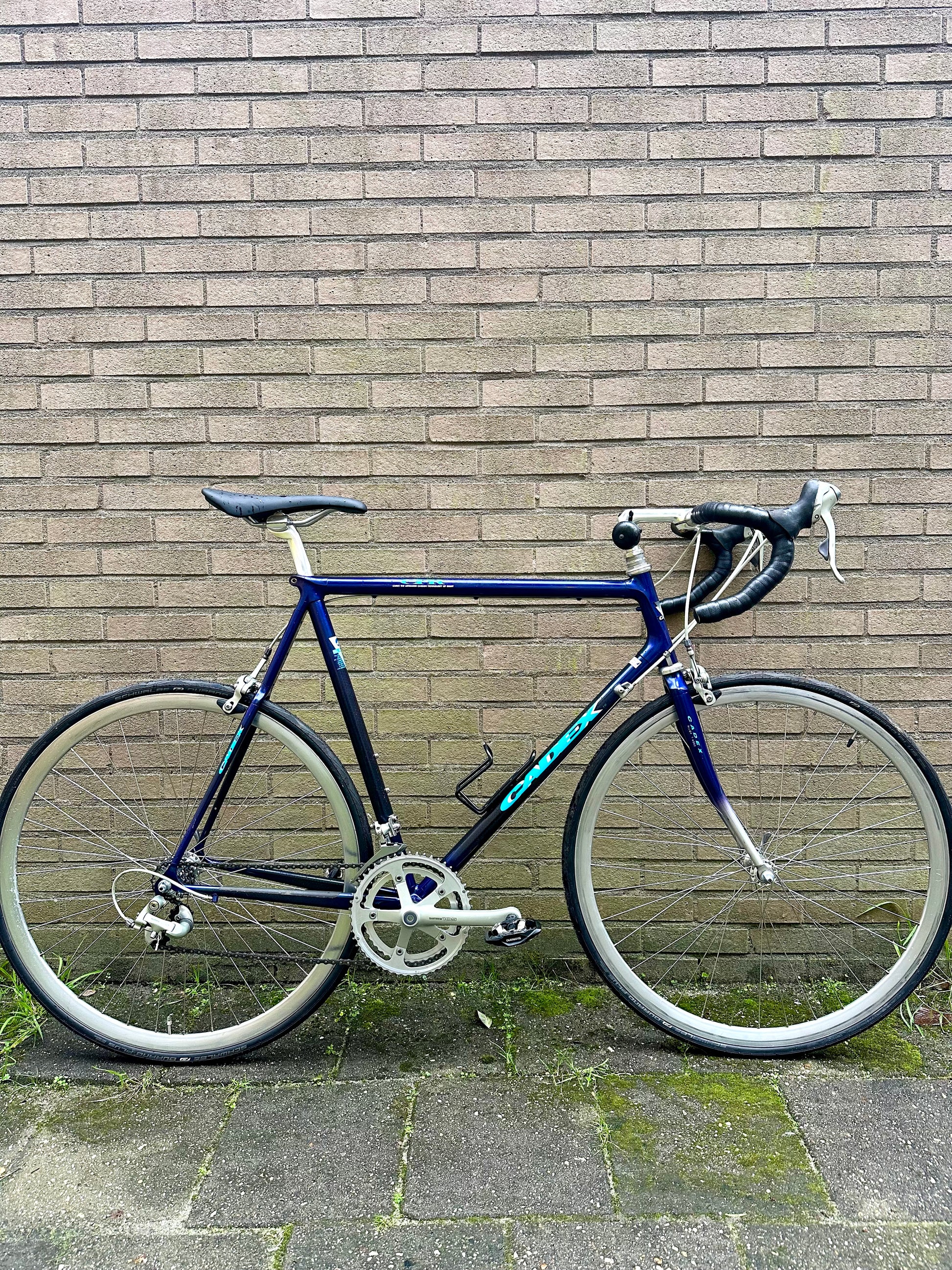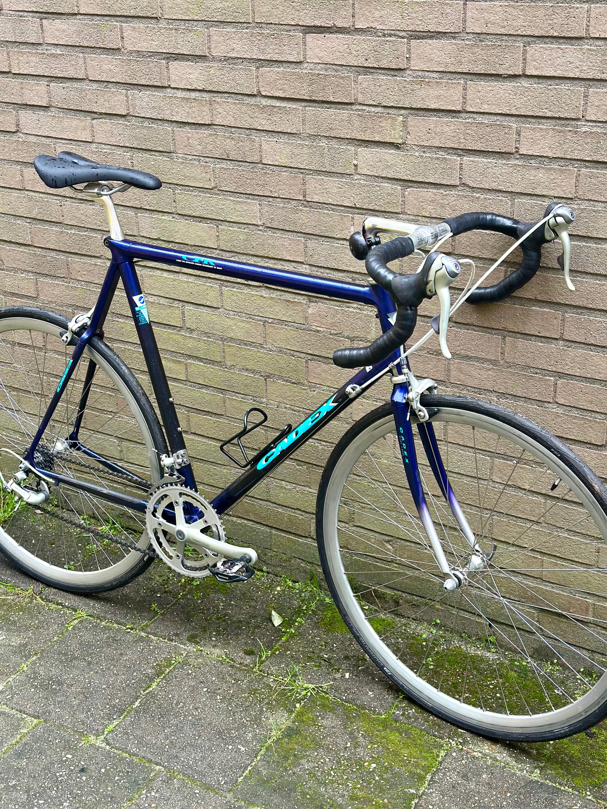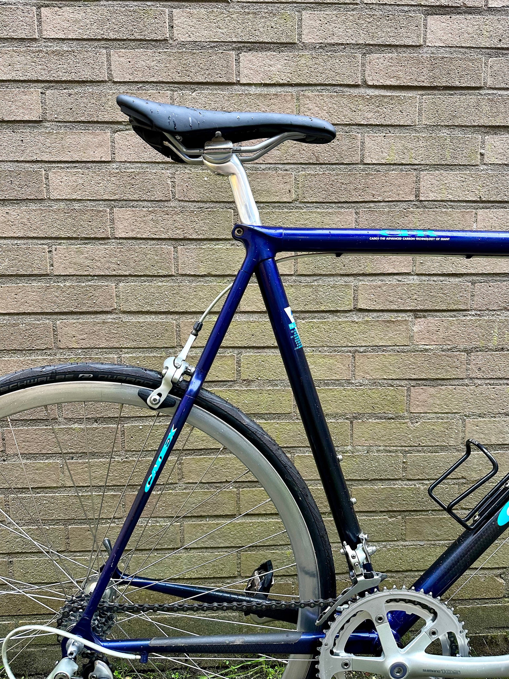 The Giant Cadex is a cult classic, being one of the first production bicycles to pioneer carbon fiber as the material of choice for high-performance bicycles. The lugs are aluminium and the tubes are carbon composite, which nicely show the carbon latticing effect. Aggressive fork blades and rear mono-stay round off the look - plus the original paint is in top condition. Even the Shimano 105 groupset shows next to no signs of wear (look at that crank!)