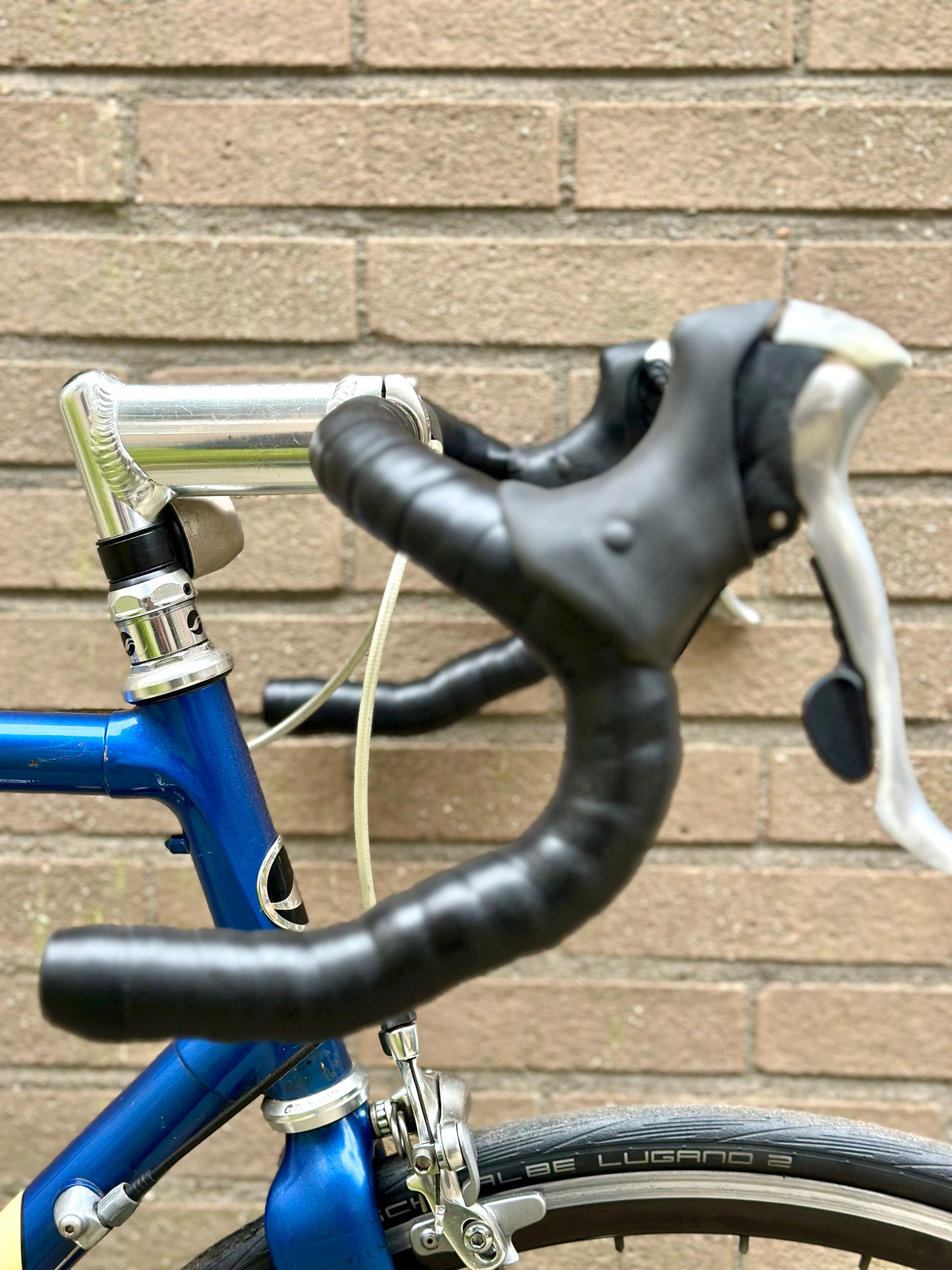 The bicycle has the top-of-the-range Shimano 600 Tricolor groupset with 8x2 integrated brake/gear shifters, powerful dual-pivot brake callipers silky smooth Shimano 600 tricolor hubs laced to Wolber gun-metal rims. Shifters are Sora. DP18 deep dish rims laced to Shimano hubs.