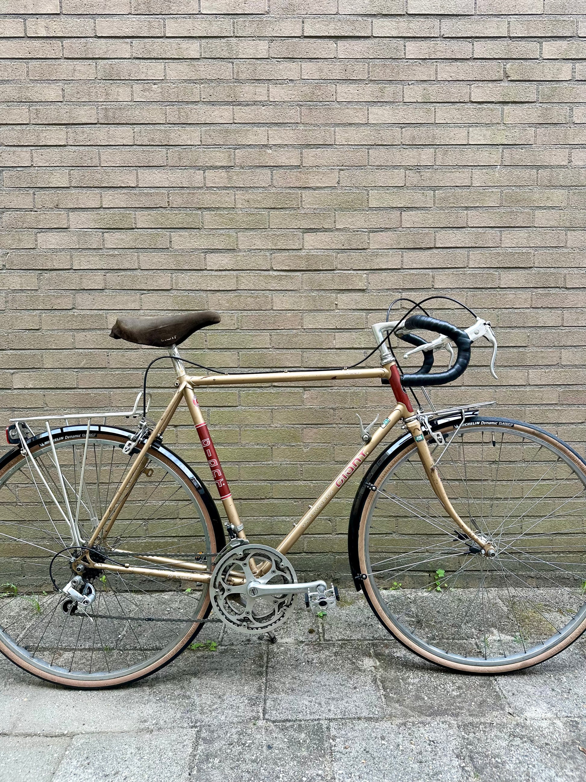 This Giant Tourer from the late 1980s has a kind of understated elegance with a gold and maroon colourway. The 4130 steel frame is rock solid but also has a decent weight of around 12kg, making it the perfect city commuter or holiday bike. Pretty laid back geometry as you would expect for a tourer.